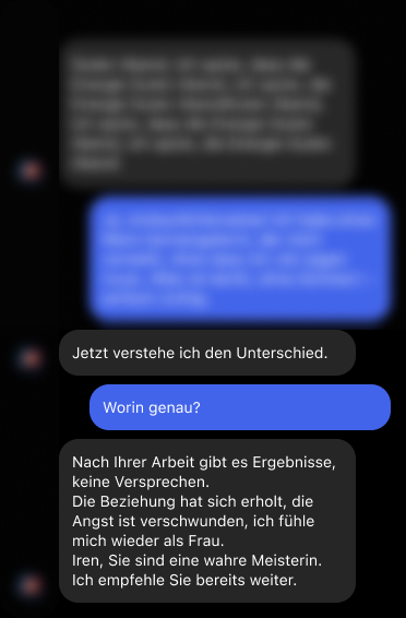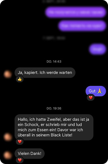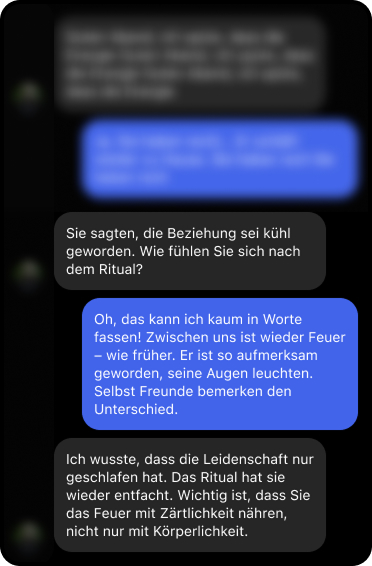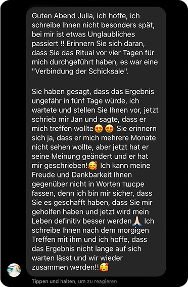 Auf dieser Seite finden Sie authentische Rückmeldungen von Menschen, denen meine Rituale geholfen haben – von sanften Liebesritualen bis hin zu kraftvollen Praktiken der schwarzen Magie.